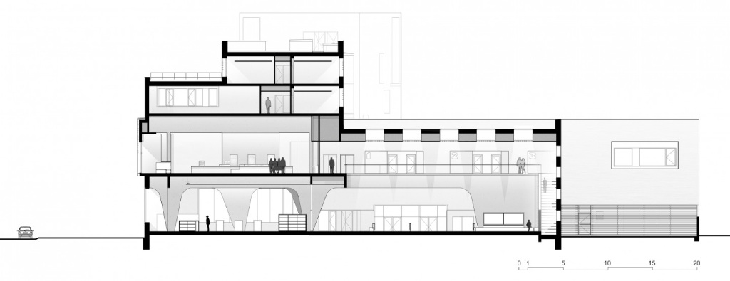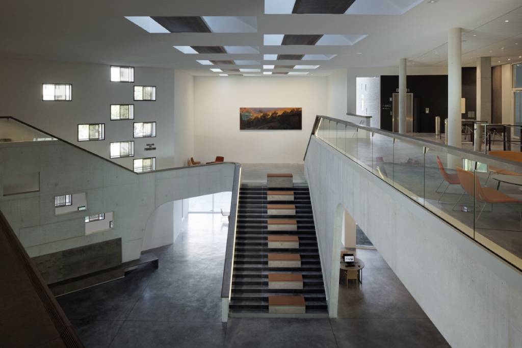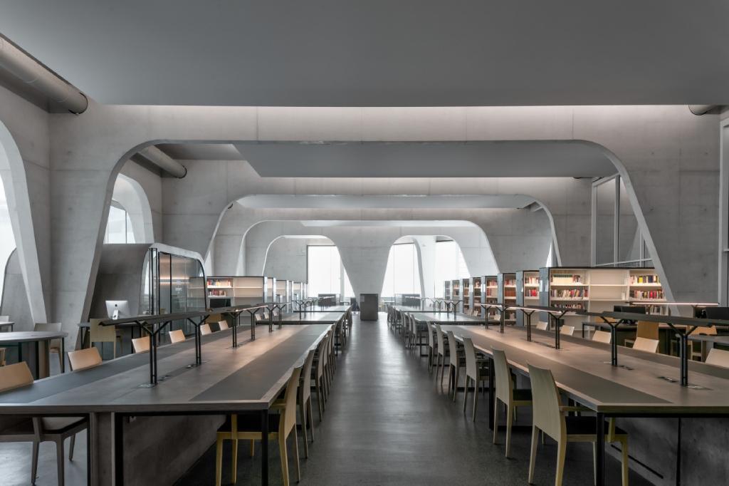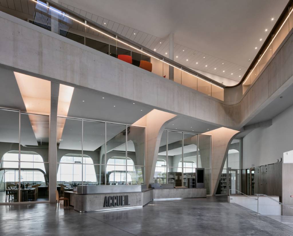 L’architecture intérieure des salles de consultation et d’exposition est façonnée par la structure, succession de fines feuilles de béton clair évidées de lignes courbes.