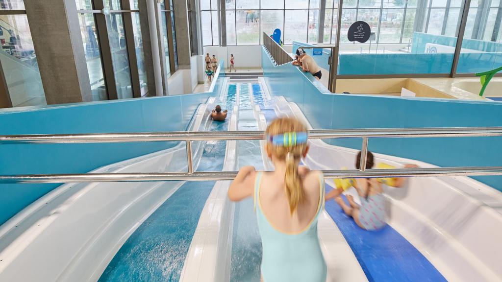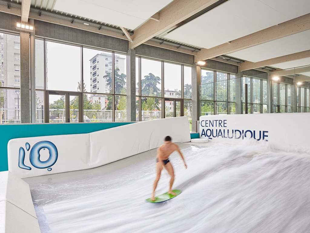 Halle Ludique : Bassin ludique 310 m2 avec echauffement 4 couloirs, Splashpad intérieur, pentagliss 3 pistes, Vague de Surf artificielle.